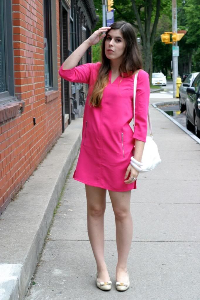 H&M shift dress, vintage Ferragamo flats, vintage leather purse, and vintage plastic bangles.
