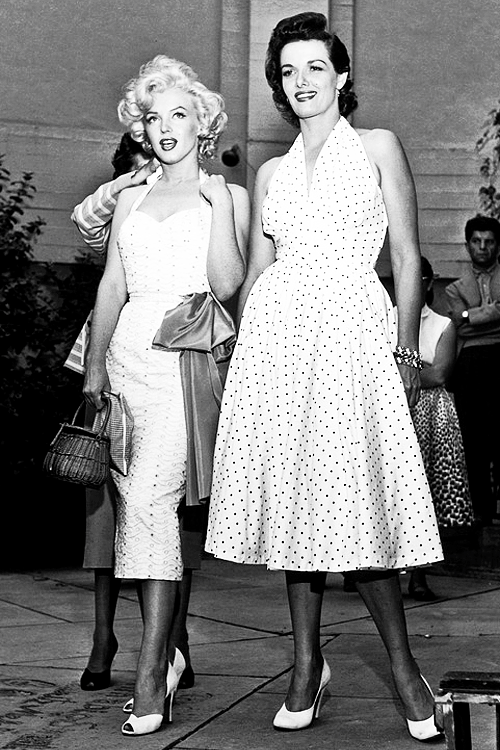 On what most likely will be the last 80 degree day we have here in Rochester, I knew I had to wear something I forgot to wear over the summer. That just happened to be this beautiful dress from the 50's. The last time I wore it was way back HERE. Unfortunately, due to my massive (and unhealthy) collection of clothes, I just remembered to alter it. Finally, it's perfect and then I forget to wear it. Typical me. I'm happy it got to go for a spin. It's quite a gem. I can't think of another dress in my vintage arsenal that truly makes me feel like I stepped back in time. To the reign of Jane Russell and Marilyn Monroe. Speaking of Jane Russell, I found a picture of her wearing a dress very similar to this one. Needless to say, I freaked out just a little bit knowing I had one like it.
