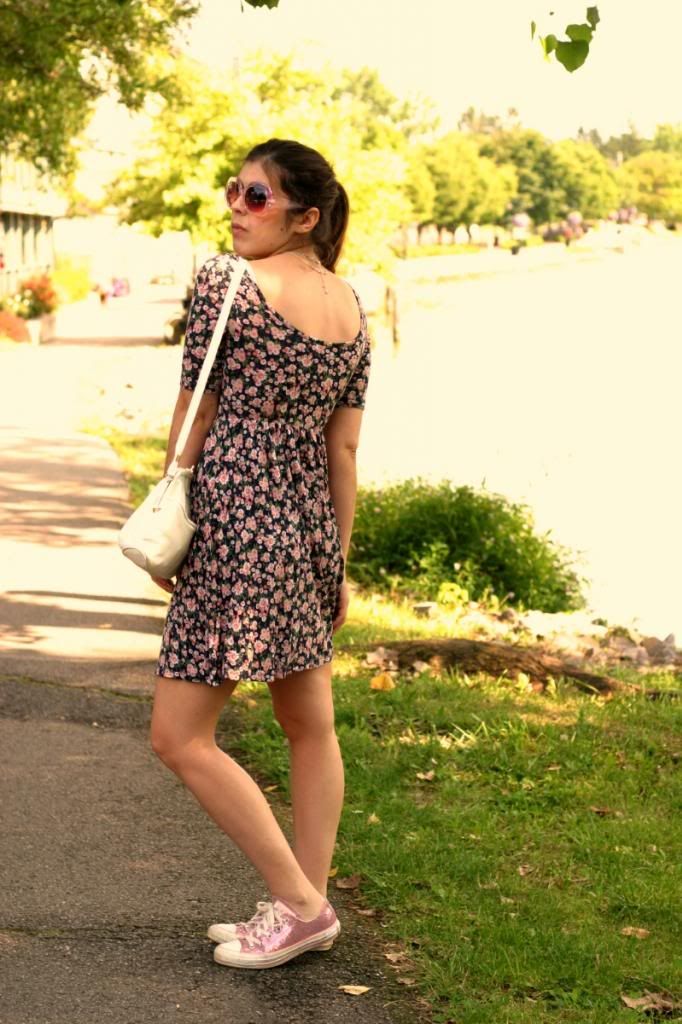 Thrifted Forever 21 dress, vintage bag, Rue 21 sunglasses, and thrifted Converse.